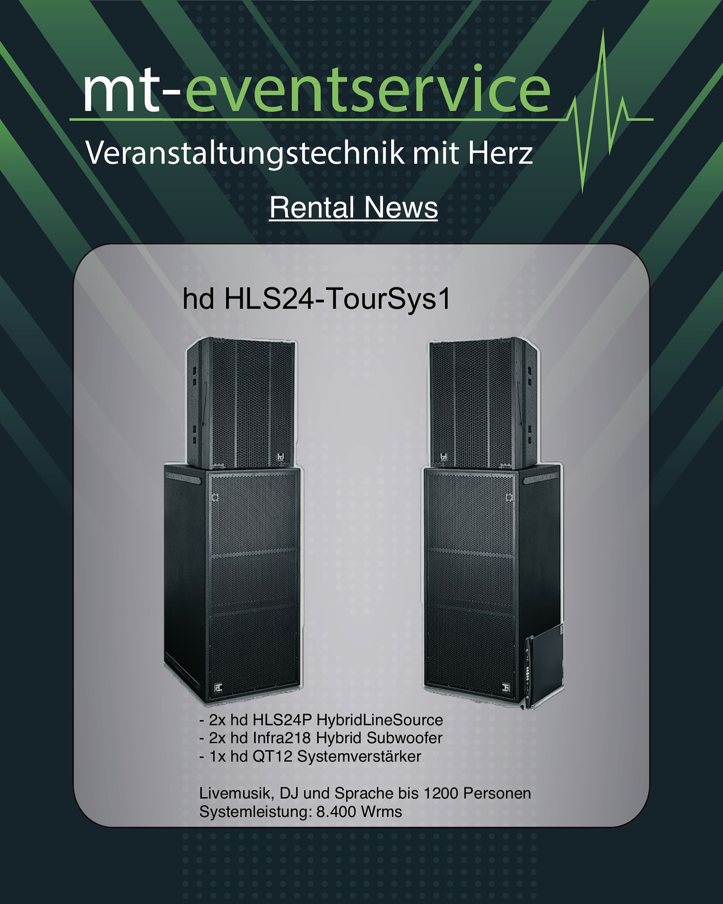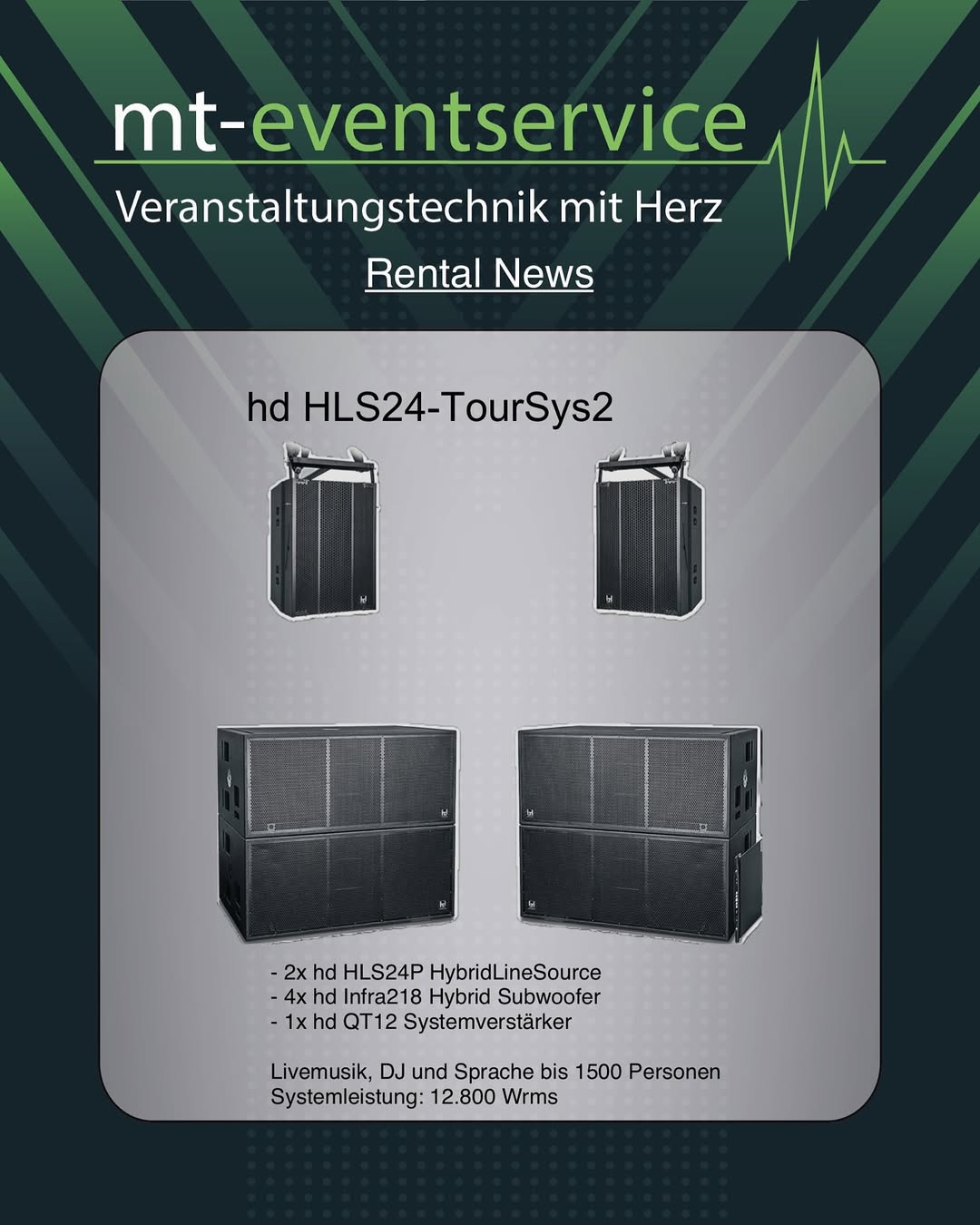 Unser Equipment-Portfolio wächst weiter: Ab sofort verstärken weitere hochwertige Komponenten von Harmonic Design unser Angebot. Mit den neuen Infra 218 Subwoofern und den HLS24 TourSys 1 und 2 können wir Ihnen nun noch mehr Leistung und Flexibilität für Ihre Veranstaltungen bieten.